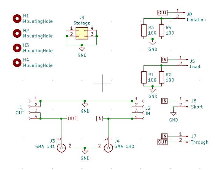 The NanoVNA should be calibrated before use, and in the documented project, this was done with an experimental calibration tool. When calibrating as close as possible to the adaptor, it’s not possible to use the calibration standards. The calibration tool was made with another PCD, with holes drilled for vias and two 100 Ohm SMD 1206 resistors.