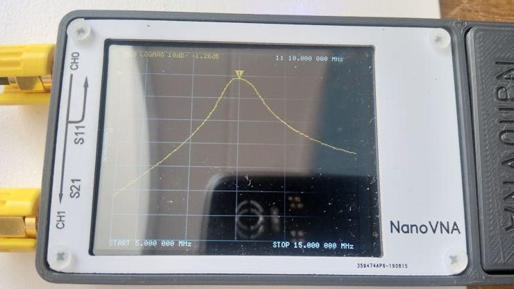 Although the filter has four pins, five holes are drilled in the PCB base of the filter holder using a perforated PCB for spacing. The fifth hole allows for a via to connect the top and bottom layers. With some soldering, the via, SMA chassis parts, and headers are connected to the base. In a few steps that, everything is set up to connect the filter to the NanoVNA.