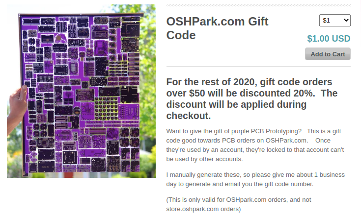 Want to give the gift of purple PCB Prototyping? This is a gift code good towards PCB orders on OSHPark.com.
