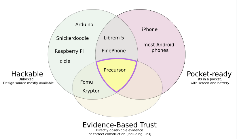 Precursor is an open hardware development platform for secure, mobile computation and communication. This pocket-sized device accommodates a built-in display, a physical keyboard, and an internal battery while remaining smaller and lighter than the average smartphone. Precursor was built for use on the road, but it compromises nothing as a development platform. Powered by an FPGA-hosted, soft-core System-on-Chip (SoC), it gives developers the freedom to inspect, verify, and customize nearly every aspect of its operation. Help us take those critical first steps toward a world in which silicon-level trustworthiness is attainable.